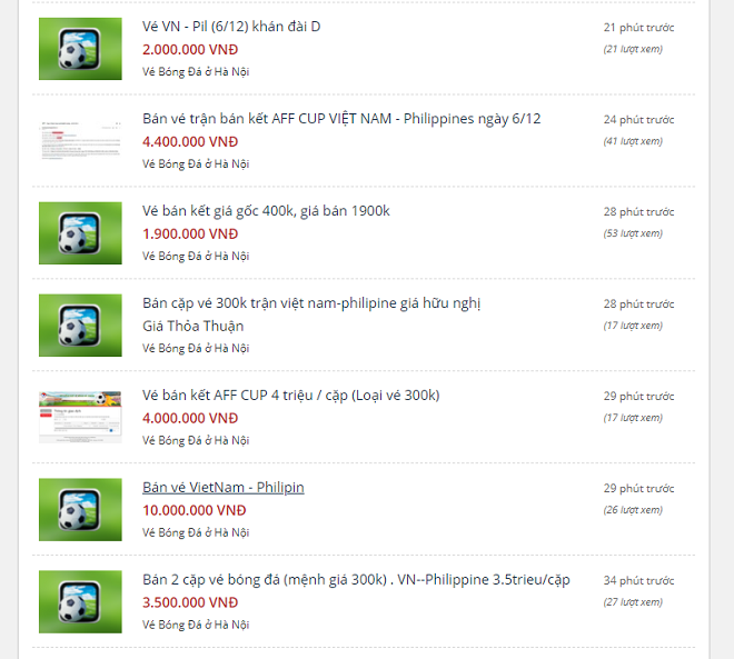 Trái ngược với trang web quá tải của VFF, trang web bán vé chợ đen có tốc độ truy cập rất nhanh. Trên đó có hàng loạt những loại vé đủ mệnh giá khác nhau trận Việt Nam - Philippines. Người đăng còn chú thích rõ giá bán thật và dưới ghi giá gốc loại vé.