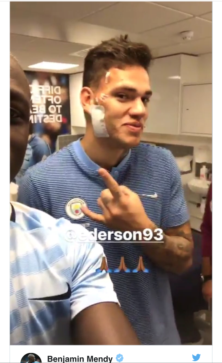 Khuôn mặt băng bó của thủ thành Ederson được đồng đội Mendy chụp lại.