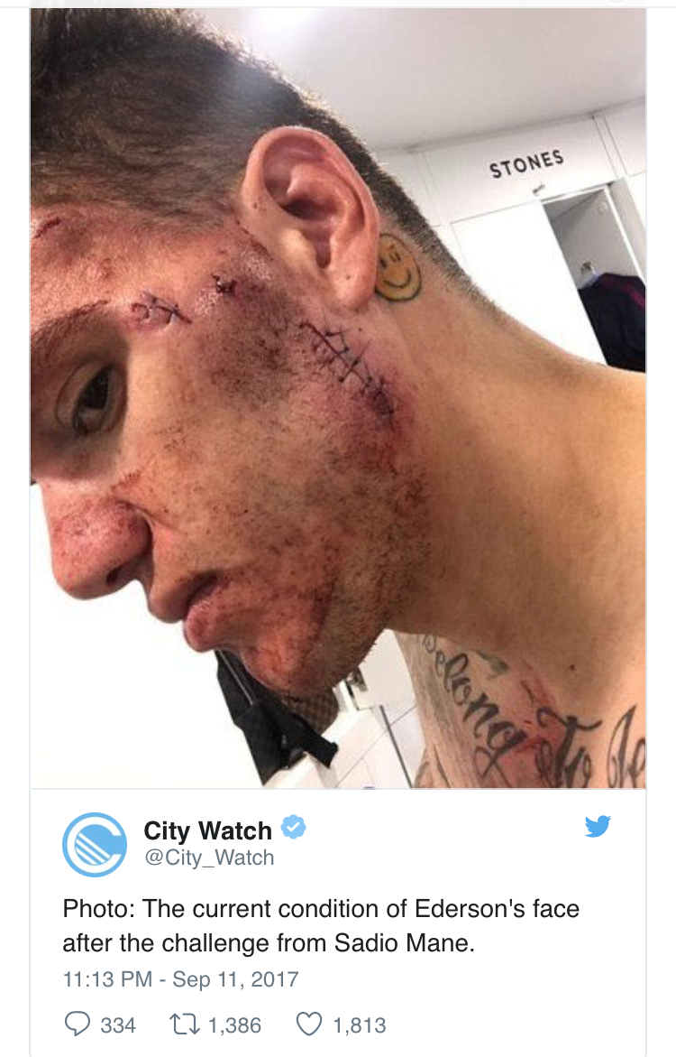 Tuy nhiên nếu Klopp nhìn thấy bức ảnh chụp lại khuôn mặt ba ngày sau vụ va chạm của Ederson thì có lẽ chiến lược gia này sẽ thay đổi suy nghĩ.