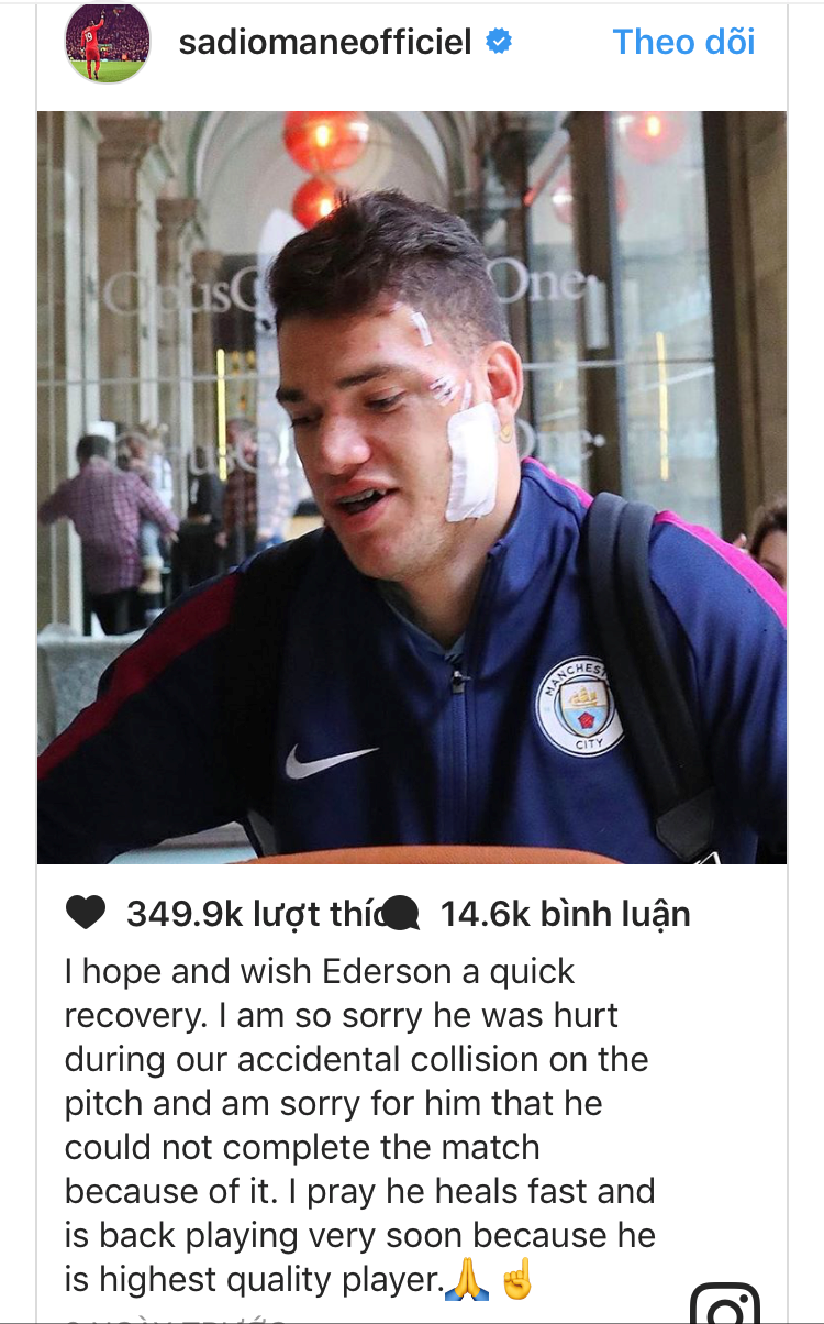 Trên trang cá nhân, tiền đạo Sadio Mane cũng đăng tải một bức ảnh thủ thành Ederson với khuôn mặt băng bó để gửi lời xin lỗi chân thành đến người đồng nghiệp: “Tôi hy vọng và chúc Ederson mau chóng bình phục. Tôi rất tiếc vì anh ấy đã bị thương trong vụ va chạm tình cờ trên sân ấy. Tôi thực sự xin lỗi vì làm anh ấy không thể chơi hết trận đấu đó. Tôi sẽ cầu nguyện cho anh ấy vì Ederson là một thủ môn tuyệt vời”.