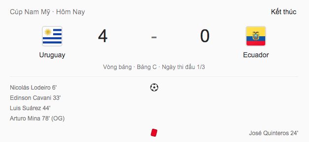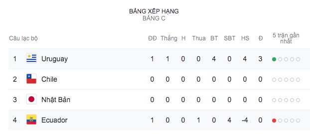 Có được chiến thắng đậm nhất giải đấu tính tới thời điểm này, Suarez và các đồng đội tạm thời chiếm ngôi đầu bảng C. Trận đấu còn lại trong bảng giữa Chile và Nhật Bản sẽ diễn ra vào 6h00 sáng mai - 18/6.