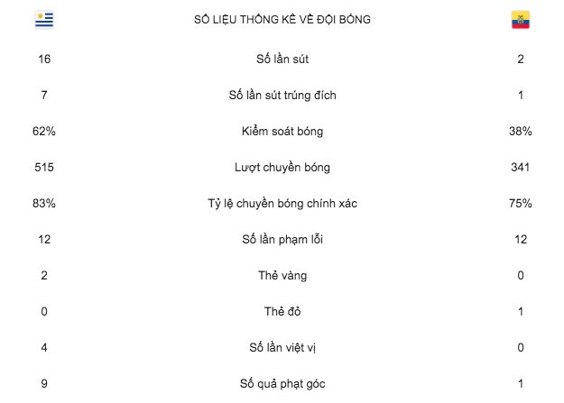 Đến giữa hiệp 1, lợi thế lại tiếp tục đến với đoàn quân của Oscar Tabárez sau khi trọng tài rút thẻ đỏ trực tiếp cho Quinteros bên phía Ecuador vì pha đánh nguội lộ liễu.