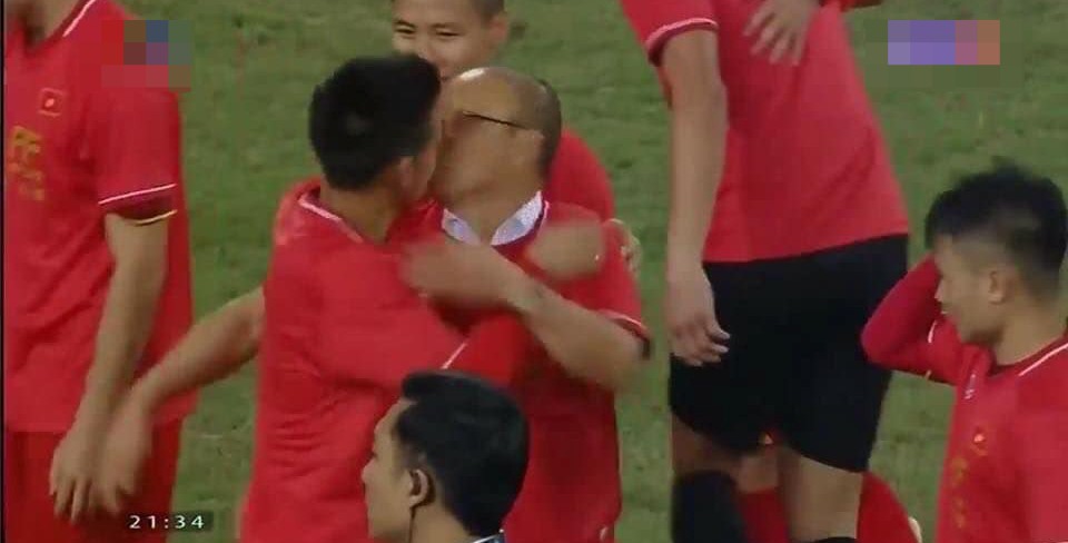 Ngay sau khi vừa kết thúc trận chung kết lượt về AFF Cup 2018, tiền đạo Văn Quyết đã lao vào sân ăn mừng cùng các đồng đội. Đáng chú ý, trong khoảnh khắc không kìm nén nổi cảm xúc, thủ quân ĐT Việt Nam có màn “khóa môi” HLV Park Hang Seo để bày tỏ cảm xúc với người thầy.