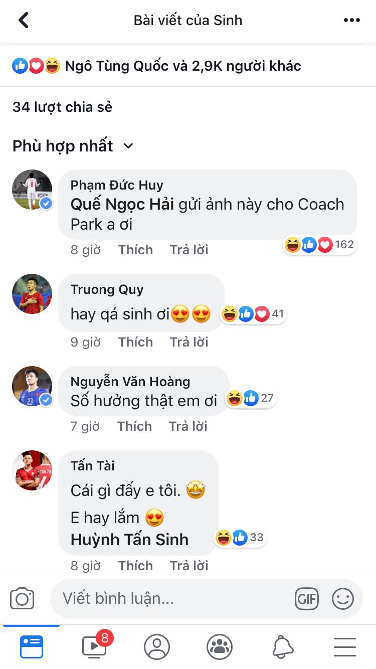 Bức ảnh nhận được nhiều lượt tương tác từ người hâm mộ cũng như sự quan tâm của giới cầu thủ. Nhiều cầu thủ trầm trồ trước nhan sắc của cô bạn gái đẹp như siêu mẫu nhưng bất ngờ hơn khi biết Tấn Sinh đã có bạn gái mà lâu nay giấu. Chàng “hoàng tử” Đức Huy nhanh chóng để lại comment cực gắt: “Quế Ngọc Hải gửi hình này cho Coach Park anh ơi”. Đức Huy rủ Hải Quế méc thầy Park (HLV Park Hang Seo) khi thấy Tấn Sinh khoe bạn gái.
