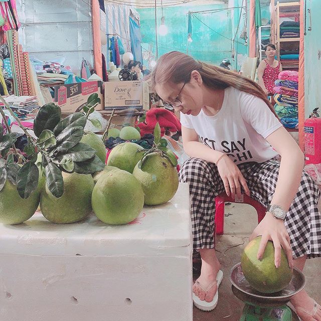 Gạt qua những bức ảnh “diễn sâu” phía trên, Nhật Lê hóa thân thành cô gái bán bưởi với dáng ngồi đúng chuẩn “bà thím”.