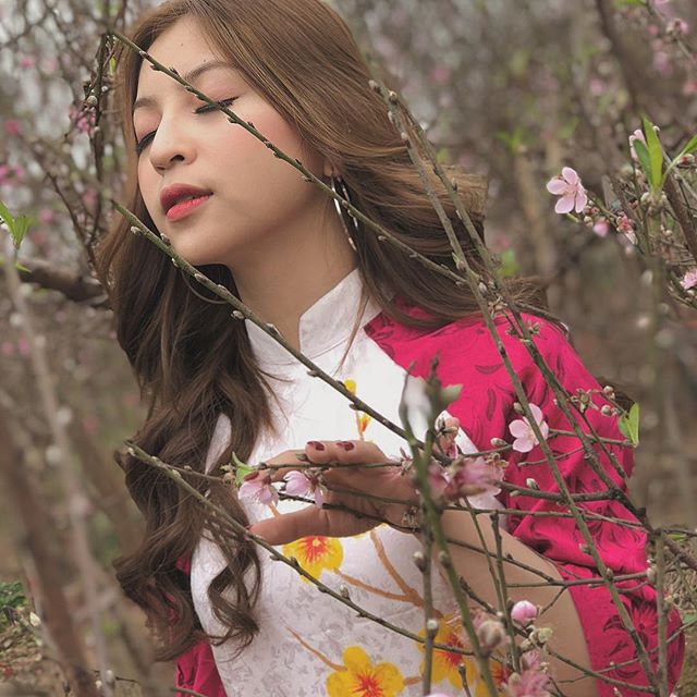 Đây là phong cách chụp hình hòa mình cùng thiên nhiên. Background với hoa mai ngày tết giúp cho bức ảnh của hot girl xứ Quảng ngập tràn mùa xuân và vô cùng tươi tắn. Với phông nền đậm sắc xuân vị Tết thế này thì dù có không làm gì thì tấm hình của Nhật Lê cũng đẹp lắm rồi!