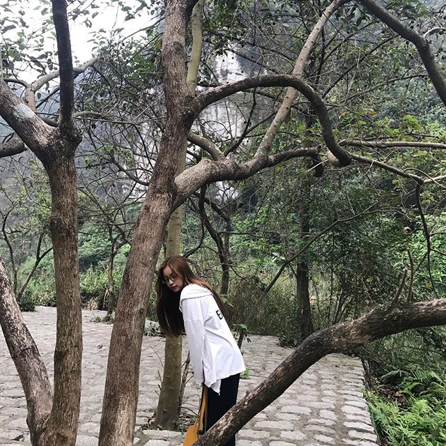 Tấm ảnh dựa vào cây trông Nhật Lê vô cùng yếu ớt và nhỏ bé cần thân cây chở che. Nhật Lê vô cùng dễ thương và tinh nghịch với cách tạo kiểu này.
