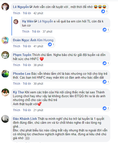 “Tôi cảm ơn HLV Park Hang-seo cũng như người hâm mộ vẫn còn nhớ tới tôi. Thực sự, đó là tự hào và vinh dự nghề. Tôi đã chia tay ĐTQG từ sau AFF Cup 2016, lâu nay vẫn cổ vũ cho các đội tuyển của chúng ta.