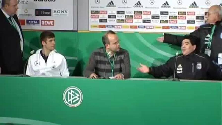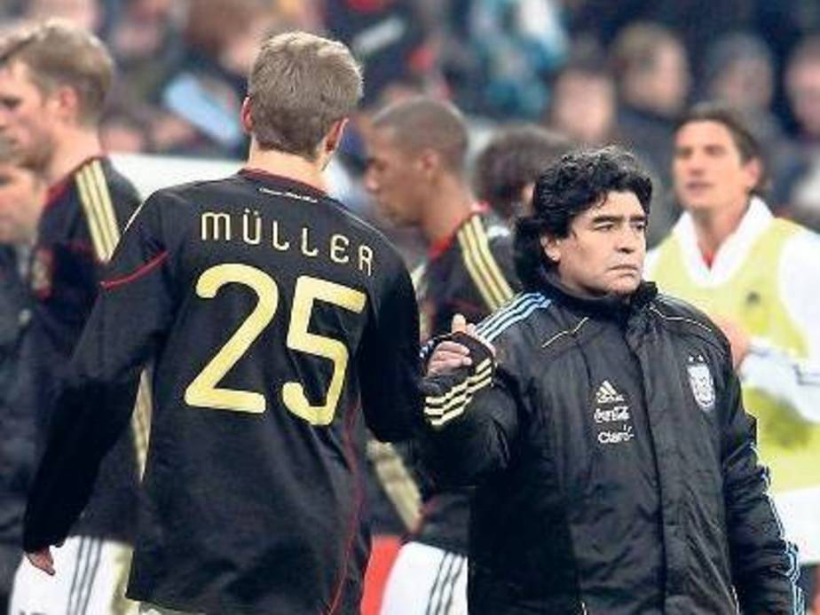 Đến năm 2010, Maradona trở thành tâm điểm của báo chí Đức khi từ chối ngồi họp báo chung với Thomas Muller. Từ chối đã đành, “cậu bé vàng” chế giễu Muller là “cậu bé nhặt bóng” vì ông không hề biết tên, tức chẳng có số má gì trong làng bóng đá. Sốc đến mức Muller phải rời bàn họp báo thì Maradona mới chịu trả lời báo chí.