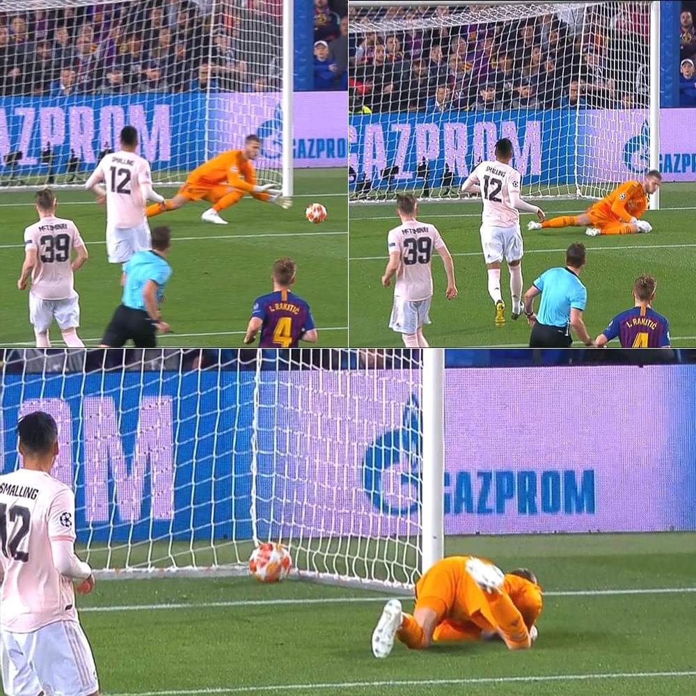Đó là thời điểm thầy trò HLV Ole Gunnar Solskjaer đang bị dẫn trước 0-1. Messi có pha sút bóng bằng chân phải không quá hiểm hóc nhưng thủ môn De Gea bất ngờ để bóng lọt qua tay rồi lăn vào lưới trong sự bất ngờ của các CĐV có mặt trên sân Nou Camp.