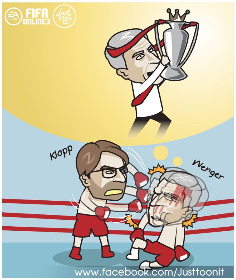 Fanpage Justoonit mô tả Wenger như một tay đấm luôn mơ màng tới chức vô địch, trong lúc đang bị “tẩn” cho bầm dập.