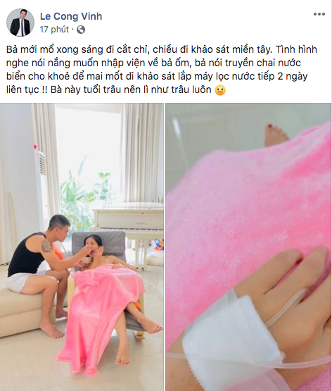 “Bả mới mổ xong sáng đi cắt chỉ, chiều đi khảo sát miền Tây. Tình hình nghe nói nắng muốn nhập viện về bả ốm, bả nói truyền chai nước biển cho khoẻ để mai mốt đi khảo sát lắp máy lọc nước tiếp 2 ngày liên tục. Bà này tuổi trâu nên lì như trâu luôn“, Công Vinh chia sẻ trên trang cá nhân.
