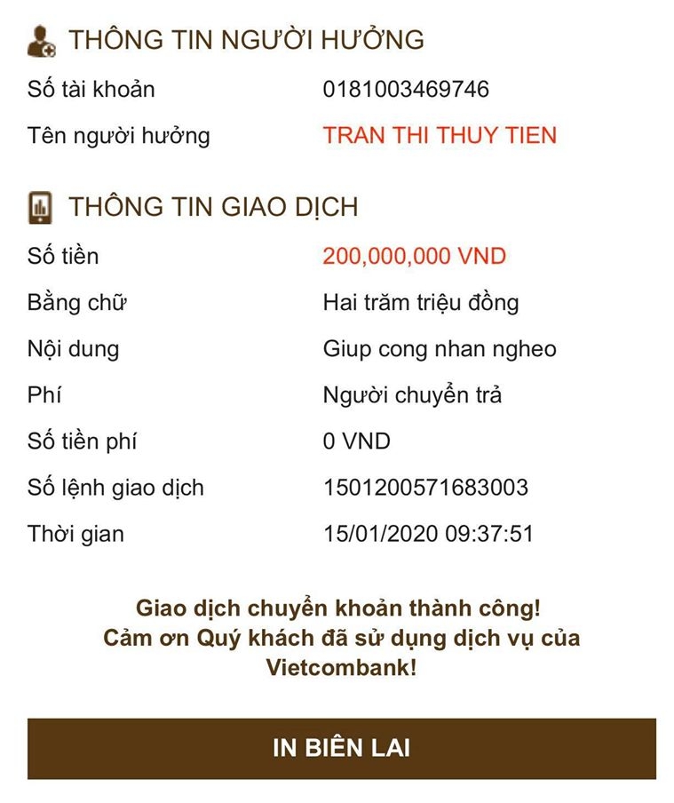 Tiên chuyển khoản 200 triệu vào số tài khoản riêng chỉ để dành từ thiện của mình trước, và số tiền này cũng không thấm vào đâu do số lượng công nhân quá lớn, nên mong muốn kêu gọi thêm mọi người mỗi người 1 ít chúng ta cùng góp gió thành bão để giúp đở chút tiền tết cho công nhân nghèo gặp khó khăn này nhé…”, Thủy Tiên viết trên trang cá nhân.