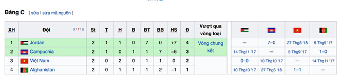 BXH bảng C Vòng loại Asian Cup 2019.