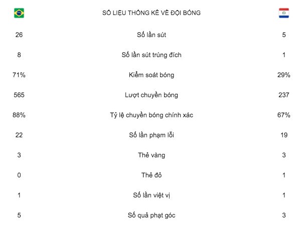 Trên chấm luân lưu, Selecao thể hiện bản lĩnh lớn hơn khi chỉ đá hỏng 1 quả còn Paraguay đã 2 lần không thành công trong việc chiến thắng thủ môn Becker, qua đó nhường tấm vé vào vòng bán kết cho thầy trò HLV Tite.