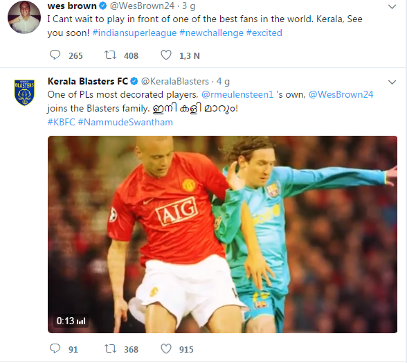 Cựu hậu vệ của Manchester United tới Ấn Độ. Hậu vệ Wes Brown đã ký hợp đồng với đội bóng Ấn Độ Kerala Blaster .