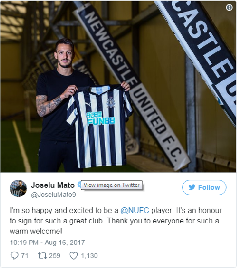 Joselu vừa đăng lên trang cá nhân hình ảnh anh cầm chiếc áo của Newcastle. Cầu thủ cảm thấy rất hạnh phúc khi được là thành viên của chích chòe.
