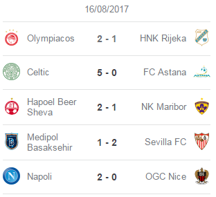 Centic gần như đặt chân vào vòng bảng Champion League mùa này sau chiến thắng ấn tượng 5-0. Napoli cũng có lợi thế khi dành chiến thắng 2-0 trước Nice. Kết quả cụ thể nư sau: