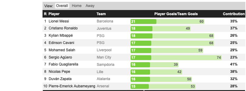 Những chân sút hàng đầu các giải VĐQG tại châu Âu.