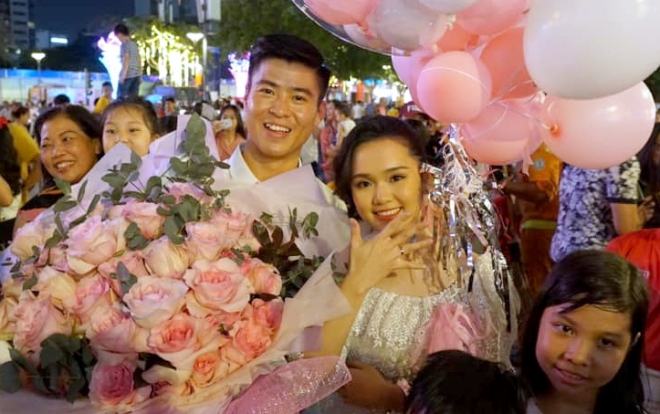 Không ngần ngại, chàng trung vệ tuyển Việt Nam liền đặt lên môi cô gái của mình một nụ hôn ngọt ngào trong tiếng vỗ tay rào rào của hàng trăm người chứng kiến