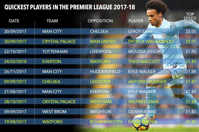 Tờ The Sun vừa đưa ra danh sách 10 tình huống chạy nhanh nhất tại Premier League mùa giải này. Theo đó, tính đến thời điểm này, tiền vệ Leroy Sane của Man City đang là người dẫn đầu danh sách với vận tốc lên đến 35,48 km/h.