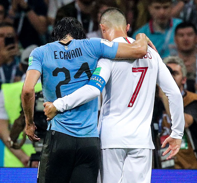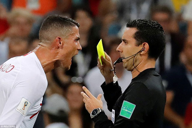 Ronaldo bực tức khiến trọng tài Cesar Arturo phải ngỡ ngàng khi rút thẻ vàng đối với siêu sao người Bồ Đào Nha trong trận gặp Uruguay.