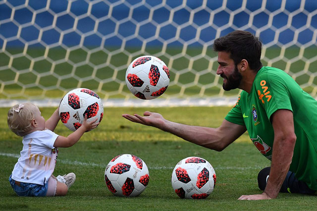 Thủ môn Allison của Brazil chơi với cô con gái Helena trong buổi tập trước trận gặp Bỉ.