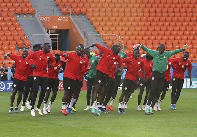 Các cầu thủ Senegal cùng nhau nhảy rất vui vẻ trong một buổi tập.