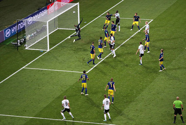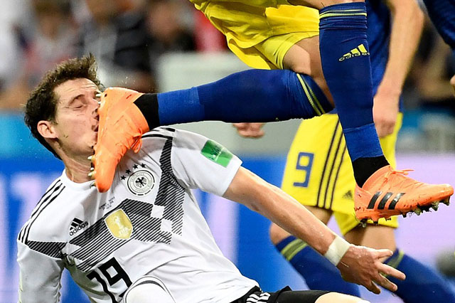Tiền vệ Sebastian Rudy của ĐT Đức lãnh trọn cái gầm giày của Ola Toivonen bên phía Thụy Điển.
