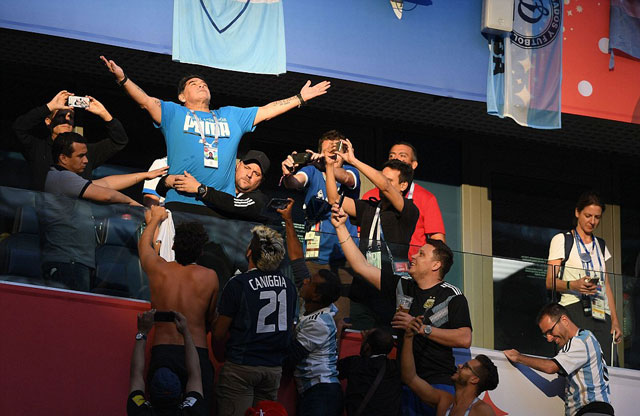 Diego Maradona có nhiều khoảnh khắc đáng nhớ tại World Cup 2018. Trong đó có cả tốt lẫn xấu. Đây là hình ảnh huyền thoại bóng đá Argentina ăn mừng bàn thắng của siêu sao Lionel Messi.
