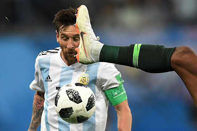 Siêu sao Lionel Messi suýt bị cầu thủ Nigeria đạp vào mặt.