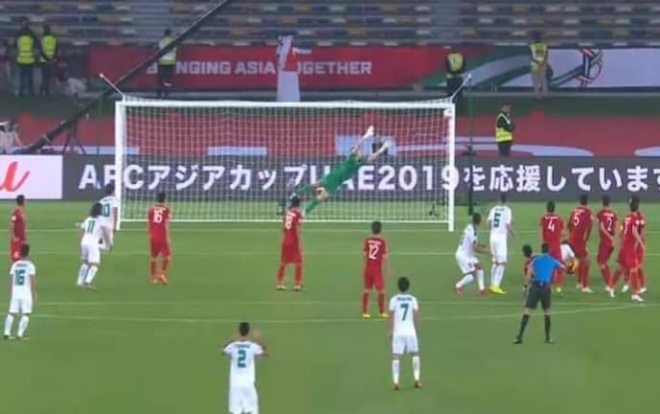 Tình huống ghi bàn từ quả đá phạt bên phía ĐT Iraq.