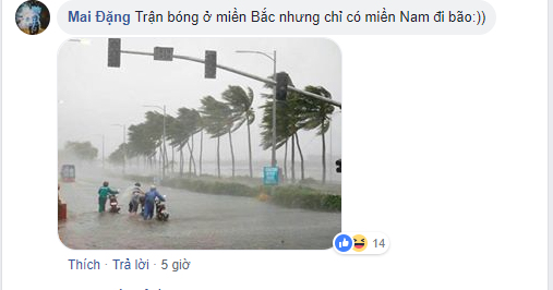 CĐV hài hước chia sẽ: ” Trận bóng ở miền Bắc nhưng chỉ có miền Nam đi bão”. Số là, miền Nam đang phải đón nhận cơn bão số 9 đổ bộ vào đất liền.