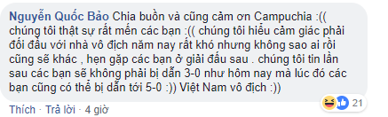 Một vài CĐV cũng thể hiện sự tiếc nuối, chia buồn sâu sắc đến ĐT Campuchia và hẹn gặp lại những chiến binh Angor vào năm sau với chiến thắng thắng tưng bừng hơn 5-0 cho ĐTVN.
