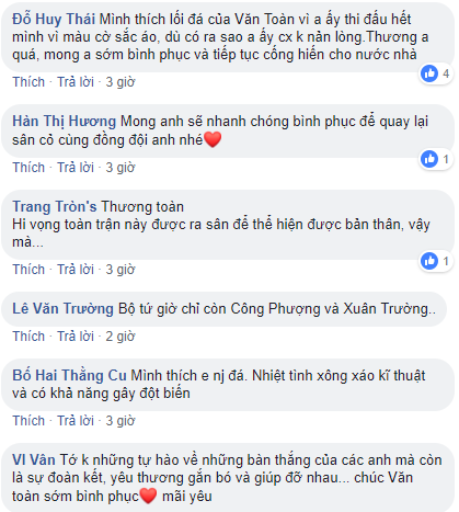 Niềm vui chiến thắng của ĐT Việt Nam dường như không được trọn vẹn vì chấn thương đáng tiếc trong lúc tập của Văn Toàn. Rất nhiều lời động viên gửi tới cầu thủ người Hải Dương và chúc cầu thủ này sớm bình phục và trở lại thi đấu vì gần như tiền vệ này sẽ nghỉ thi đấu đên hết giải.