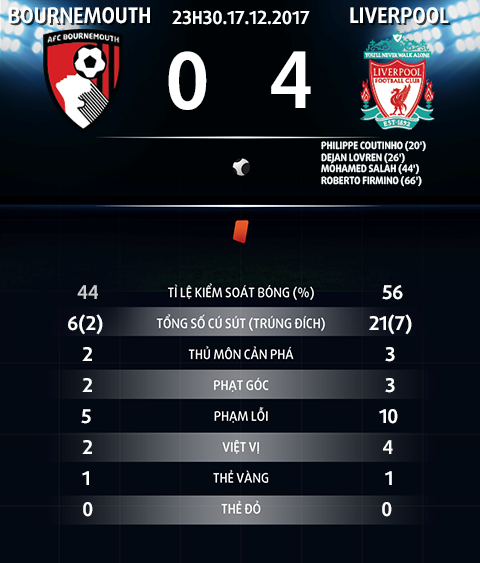 Chung cuộc, Liverpool thắng 4-0 và vượt qua Arsenal để trở lại Top 4 với 33 điểm, hơn đúng 1 điểm so với Pháo thủ thành London. Kết quả này cũng giúp The Kop trở thành đội bóng đầu tiên trong lịch sử Premier League thắng 4 trận sân khách liên tiếp với cách biệt ít nhất 3 bàn.