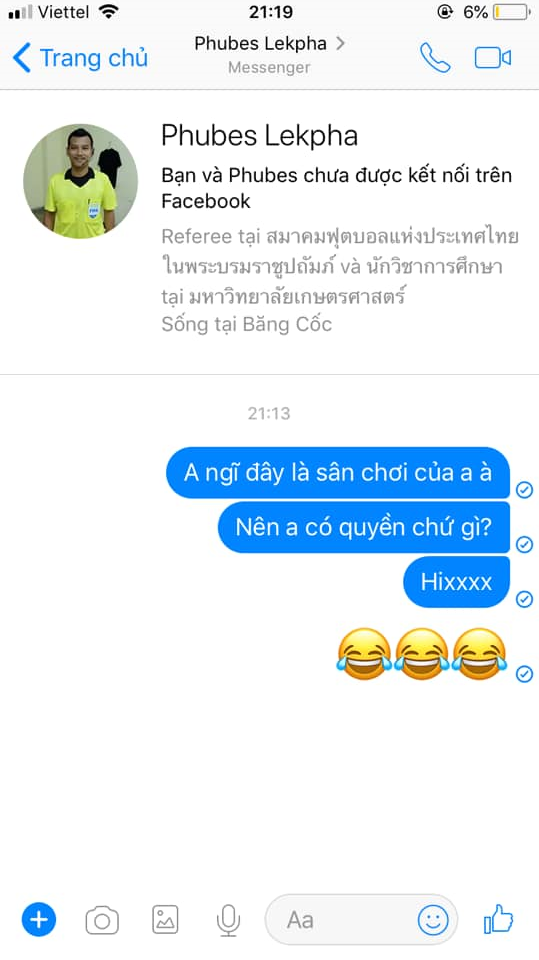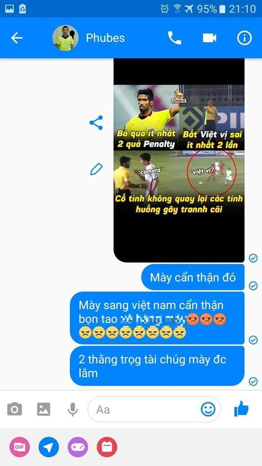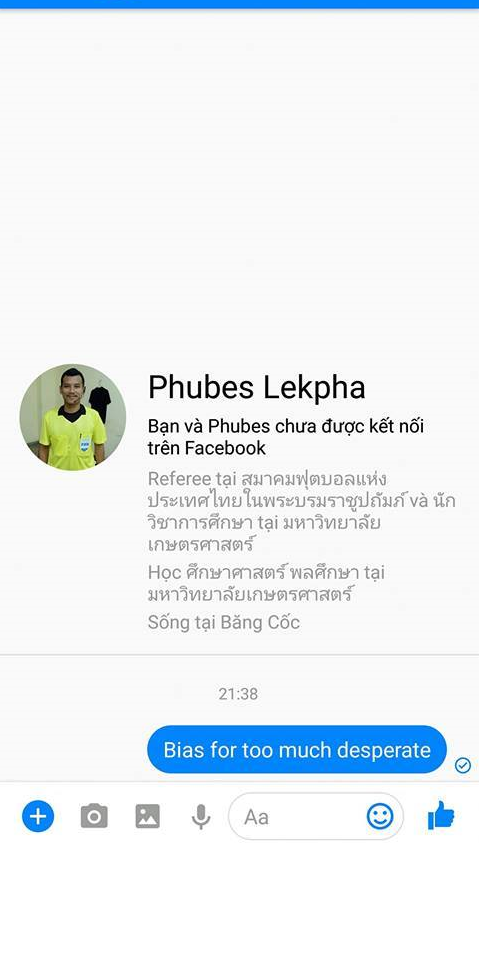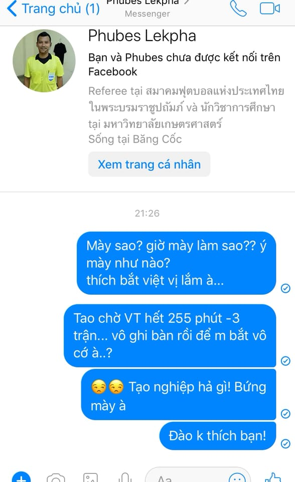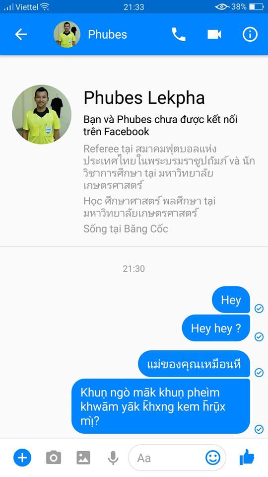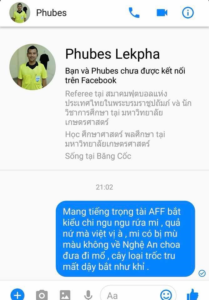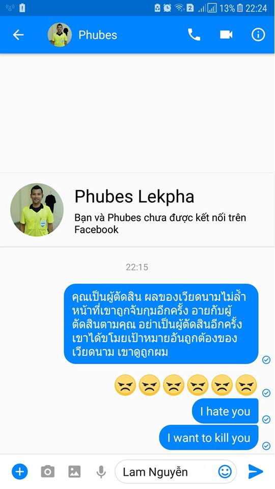 Ngay sau khi tìm được danh tính và facebook của vị trọng tài này. Fan hâm mộ Việt Nam đã “đánh phá” bằng cách gửi tin nhắn cho vị trọng tài biên người Thái Lan.
