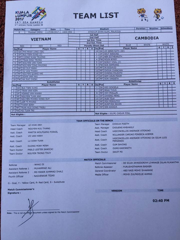 - Phút 16: Đình Trọng có pha cao chân phá bóng khá nguy hiểm khiến Sok Samnang bị đau.Phút 15: Quang Hải đá phạt góc hơi thấp từ cánh phải và một cầu thủ áo xanh đã nhanh chân phá bóng.Phút 10: Công Phượng có tình huống đi bóng vào khu 16m50 nhưng không thể tung ra cú dứt điểmPhút 7: Các cầu thủ U22 Campuchia có tình huống tấn công nguy hiểm theo hàng lang phải trái của U22 Viêt Nam, tình huống tạt bóng nguy hiểm nhưng Minh Long đã làm chủ tình hìnhPhút 5: Công Phượng có tình huống đi bóng không tốt trước khung thành của CampuchiaPhút 1: U22 Việt Nam đã tràn lên tấn công và có cơ hội đầu tiên