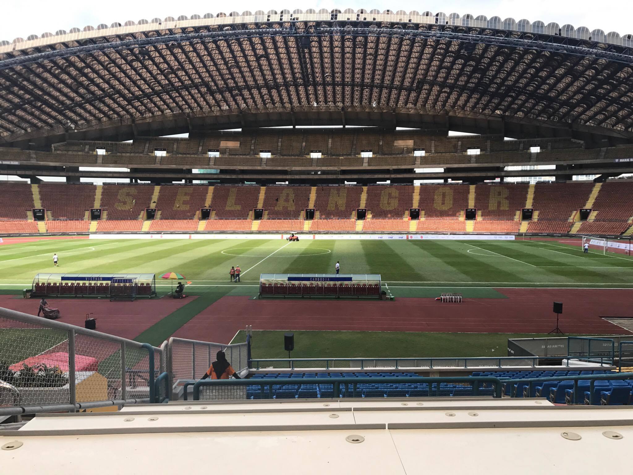 Hai đội đang bước ra sân, làm lễ chào cờ và đội trưởng hai đọi đang làm thủ tục cuối cùng trước khi bước vào trận đấu