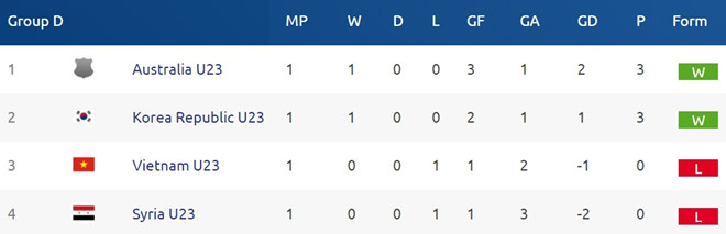 - U23 Việt Nam thua 1-2 U23 Hàn Quốc, trong khi U23 Australia thắng 3-1 U23 Syria ở trận ra quân.