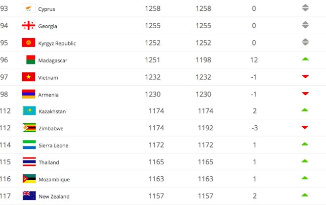 Chính sự thăng hạng của Madagascar và Haiti đã khiến tuyển Việt Nam tụt 1 bậc so với tháng trước. Việt Nam không thi đấu trận nào trong tháng qua tuy nhiên chúng ta vẫn bị trừ 1 bậc do sự thăng tiến của hai “ông kẹ” châu Phi và khu vực CONCACAF.