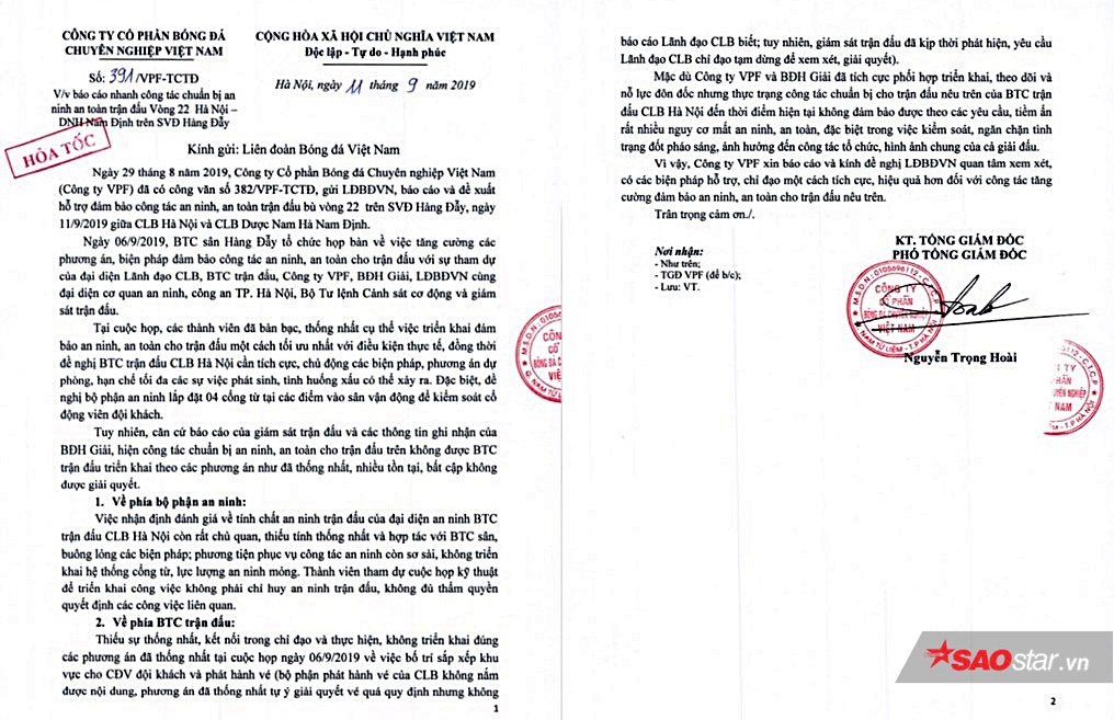 Báo cáo hỏa tốc của VPF gửi VFF vì BTC sân Hàng Đẫy không thực hiện đúng nội dung cuộc họp để đảm bảo an ninh trận Hà Nội và Nam Định.