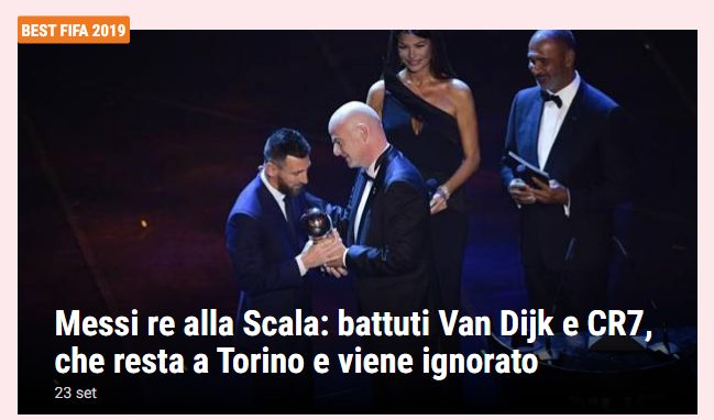 Gazzetta dello Sport, tờ báo thể thao nổi tiếng của Italia, nơi Messi được vinh danh đăng trên trang nhất dòng title với nội dung: “Messi là người giỏi nhất khi đánh bại Ronaldo và Van Dijk, trong khi CR7 vắng mặt và ở Torino”.
