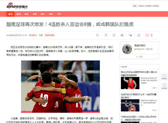 Trong một bài viết có tiêu đề: “Bóng đá Việt Nam lại tạo địa chấn, 4 chiến thắng liên tiếp để vào Top 8 ASIAD” được đăng tải trên tờ Sina mới đây, tác giả đã nhận định rằng: “Cách đây 7 tháng, U23 Việt Nam đã khiến tất cả mọi người phải bất ngờ khi vào chung kết giải U23 châu Á 2018. Bây giờ, họ lại thẳng tiến vào tứ kết ASIAD mà chưa để thủng lưới bàn nào.