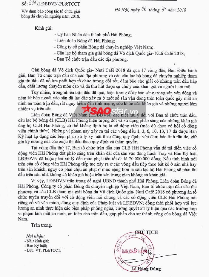 Công văn VFF gửi lãnh đạo TP Hải Phòng vào ngày 6/7.
