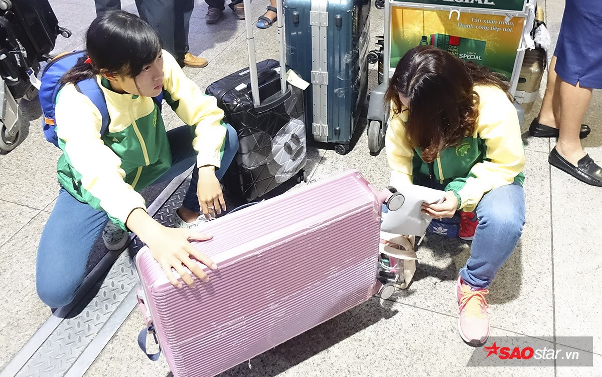 Tú Chinh cùng HLV Thanh Hương chuẩn bị hành lý tại sân bay.