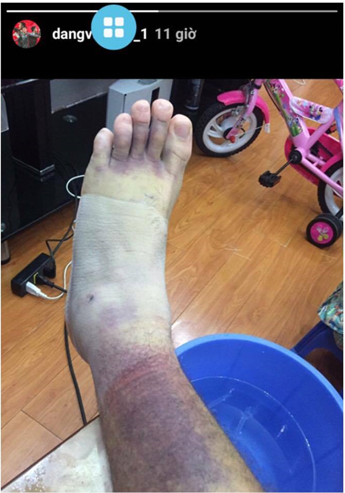 Tấm hình về chấn thương của thủ môn Đặng Văn Lâm đã xuất hiện từ tối hôm qua (19/9). Thủ môn Việt kiều đã chia sẻ trên mạng xã hội về cận cảnh cổ chân thâm tím, máu tụ và sưng to.