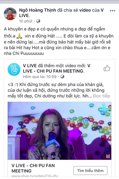 “Anh khuyên em đẹp em có quyền nhưng em đẹp để ngắm thôi. Anh xin em đừng hát… Em đòi làm ca sĩ anh khuyên em nên dừng lại, mà đừng bảo hát mấy bài dở rồi sẽ ra bài Hit hay Hot anh cũng xin chào thua em… Cảm ơn em nha Chi Pu”, Ngô Hoàng Thịnh nói.