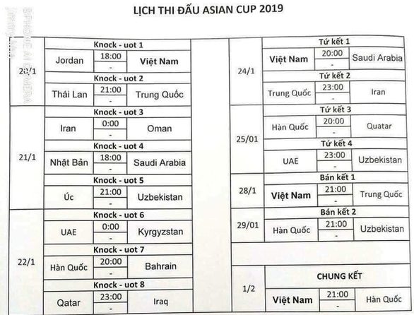 Ngoài ra, lịch thi đấu “tiên tri” về giấc mơ Việt Nam lần đầu vô địch ASIAN Cup 2019. Việt Nam hạ lần lượt Jordan, Saudi Arabia, Trung Quốc và Hàn Quốc để bước lên đỉnh vinh quang châu lục.