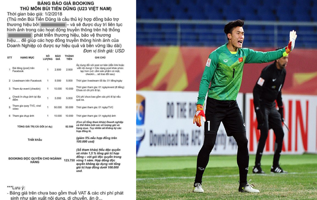 Báo giá rất cụ thể: Một bài đăng (status) quảng cáo trên trang cá nhân thủ môn Bùi Tiến Dũng có giá 2.500 USD (khoảng 57 triệu đồng), 1 lần livestream 1 tiếng, có giá 5.000 USD (hơn 110 triệu đồng). Một lần tham gia sự kiện là 10.000 USD (gần 230 triệu đồng) và 1 lần đăng ảnh, check in tại sự kiện là 5.000 USD (hơn 110 triệu đồng)…